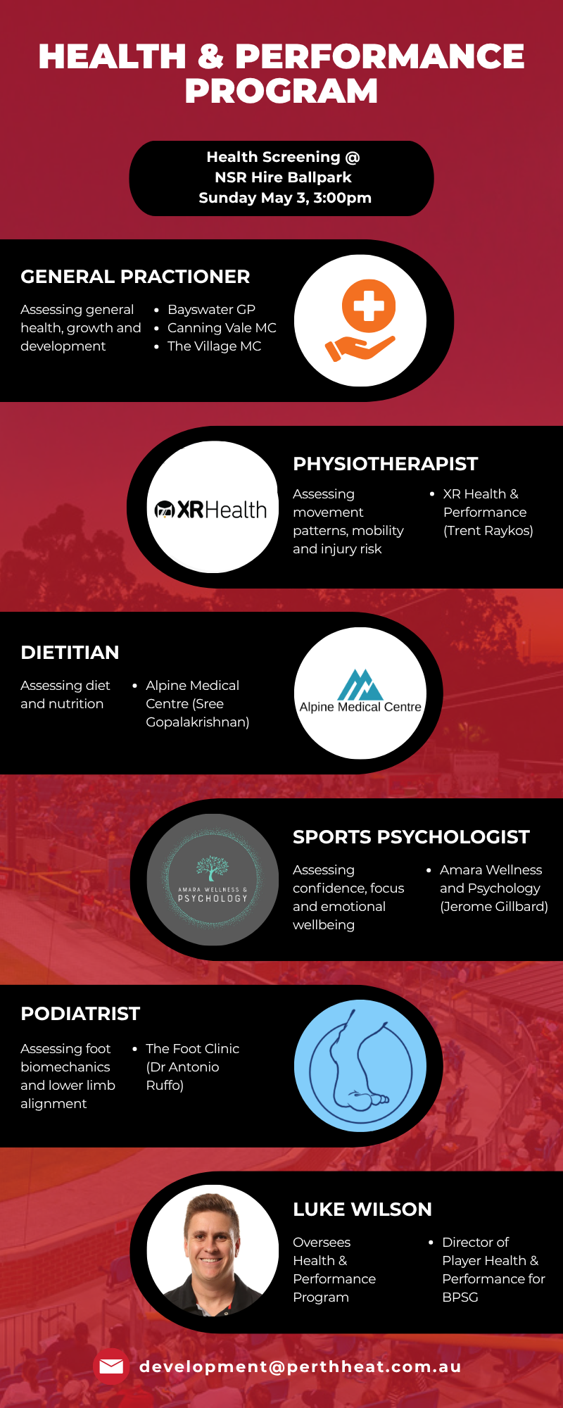 - Total Health monitoring – Supported by the Perth Heat High Performance team, including a GP, physiotherapist, dietician, psychologist, and strength & conditioning coach / exercise physiologist.